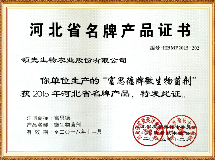 富思德牌微生物菌劑—河北省名牌產(chǎn)品證書