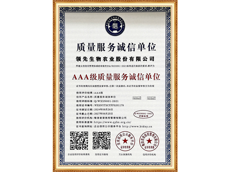 AAA級(jí)質(zhì)量服務(wù)誠信單位